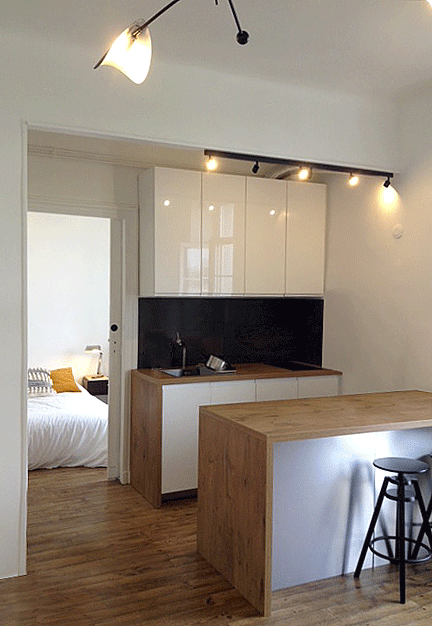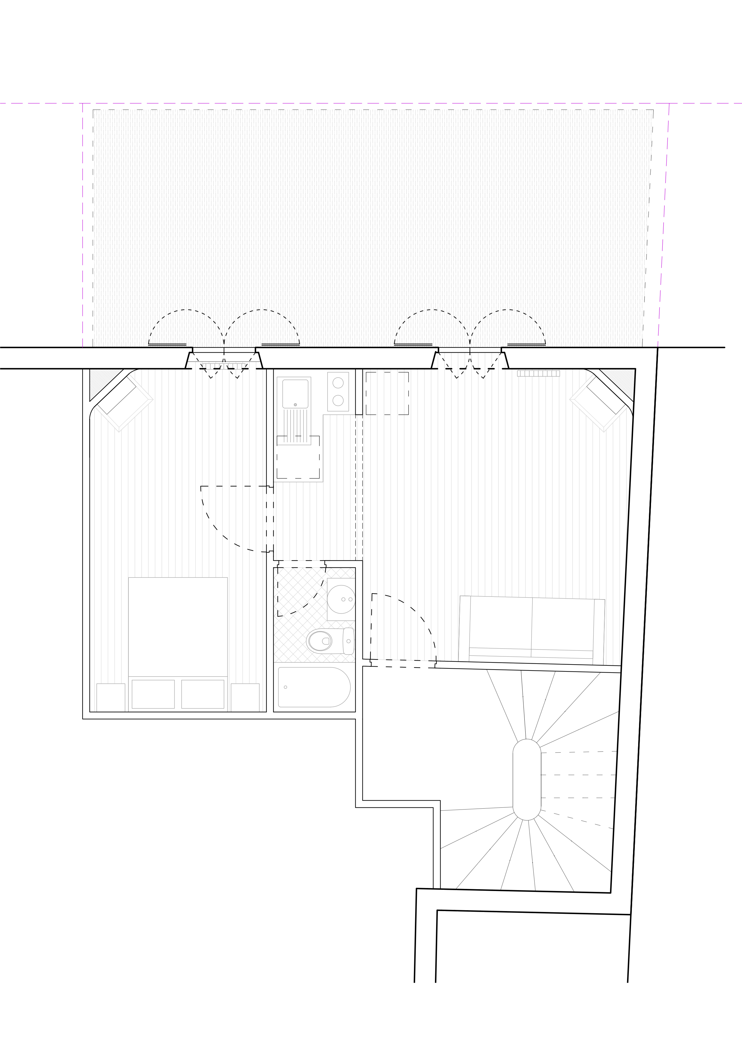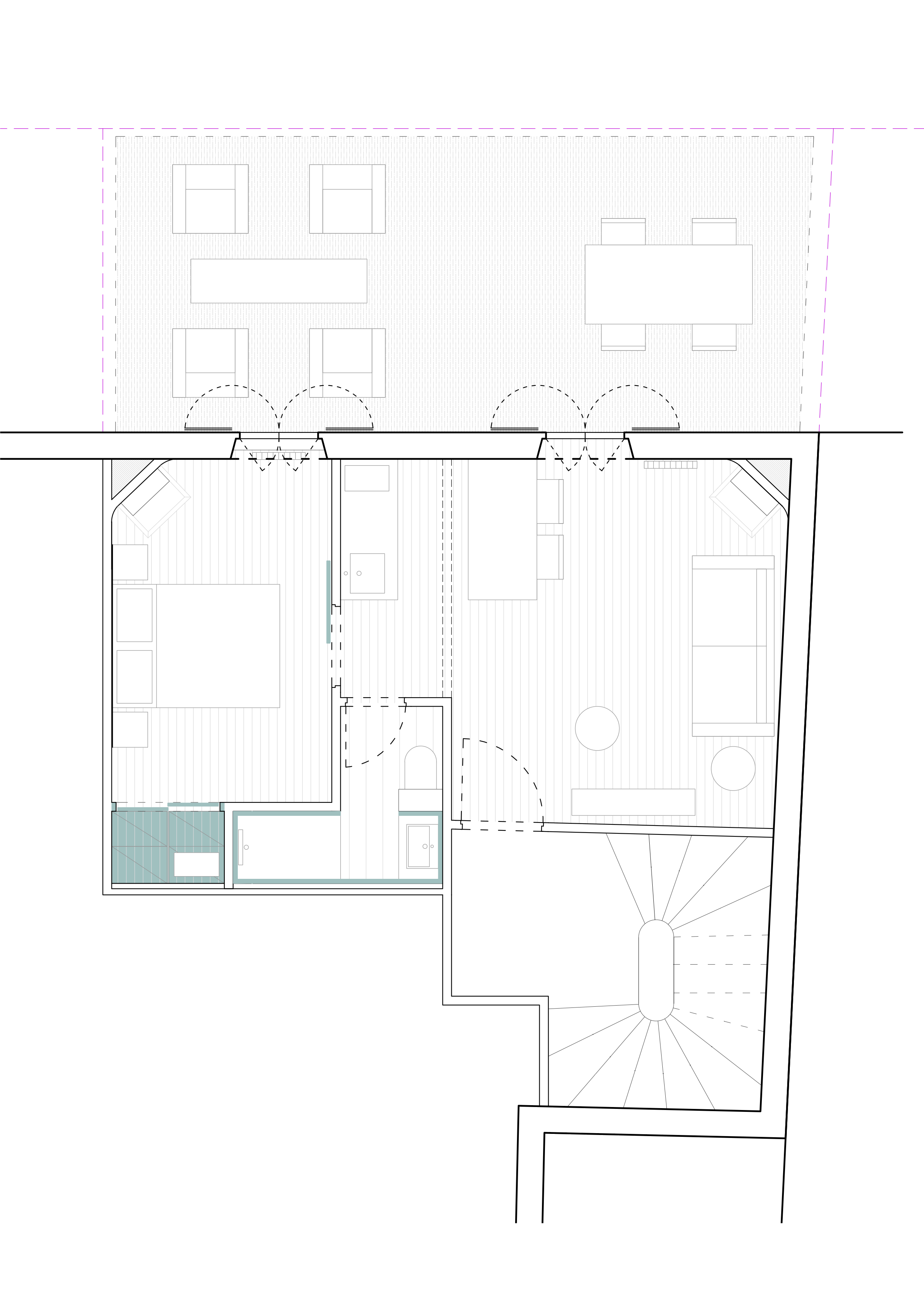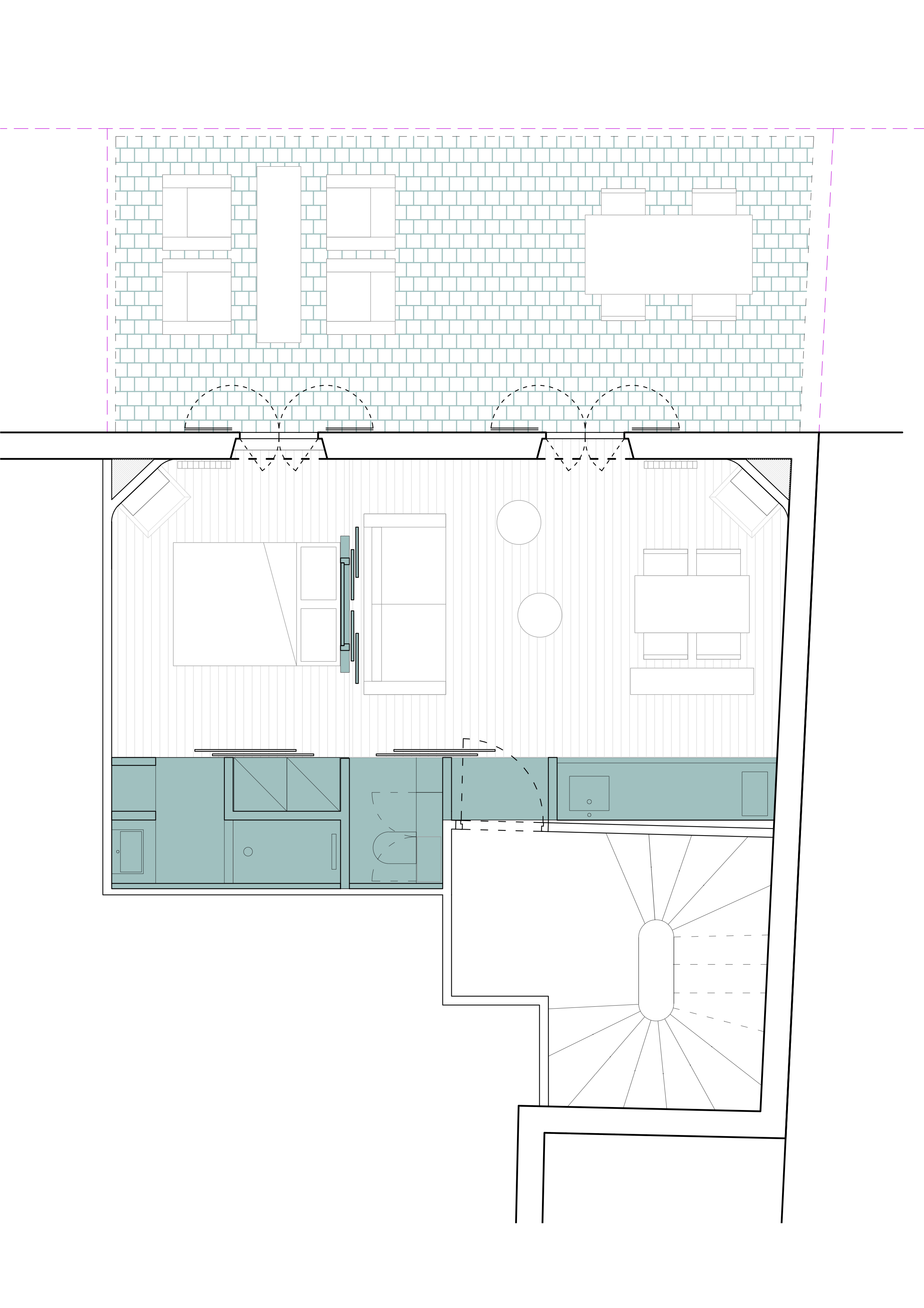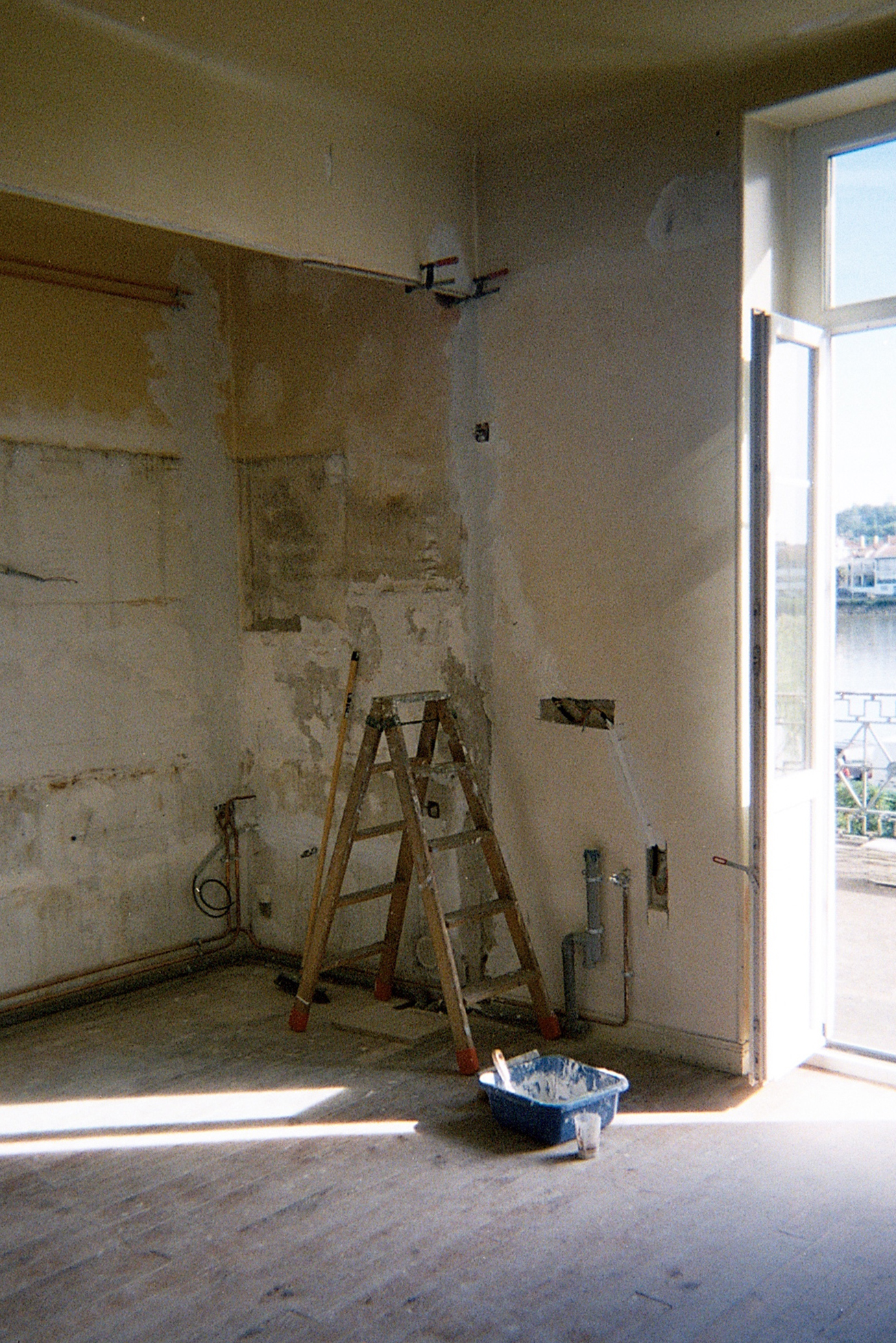 L’état des lieux révèle un logement en centre urbain presque inhabitable alors qu’il possède des qualités fortes : l’absence de couloir, de grandes ouvertures, un espace extérieur généreux et dégagé , des prestations anciennes. Le propriétaire souhaite d’une part rénover le logement pour lui-même, d’autre part anticiper un changement de programme en créant une destination mixte de logement – bureau.